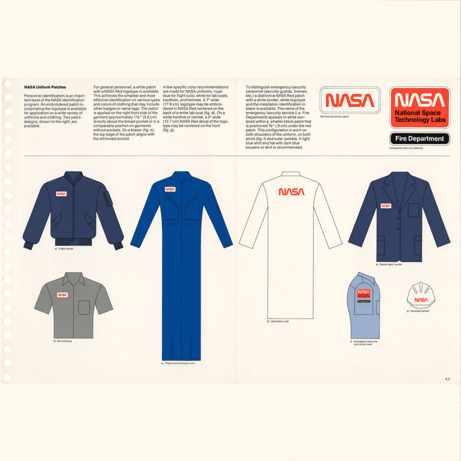 The content of the book itself is just as solid as the logo. I love how their brand identity reads almost like a textbook — it does a great job conveying NASA’s scientific, intellectual vibe, which helps to emphasize their credibility and expertise. The print medium sets it apart as well, with so many other companies today opting for digital brand books. It’s so thorough, too. Every use case down to the “confidential” stamp is included. (On a side note, how badly do you want their clothing? I would totally buy their flight jacket!)