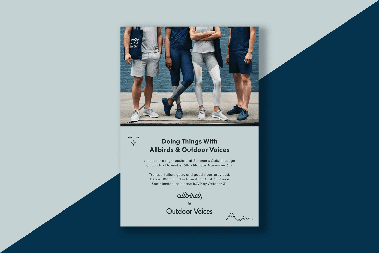 In order to achieve this, we knew we would need to find a balance between the sleek, minimalist design of the product and a sense of playfulness that would stand out to consumers amidst a market saturated with a clean, modern — and, at times, cold — aesthetic. With this in mind, we developed a geometrically-inspired visual story that heavily emphasized the product, while charming illustrations and highly-expressive, action-packed images added a sense of levity. The concept was readily embraced by Allbirds’ in-house marketing team, and in keeping with the pressing timeline, our designs were soon live on their homepage, product page, and partnerships page, as well as their digital event invitations and newsletter, displayed above.